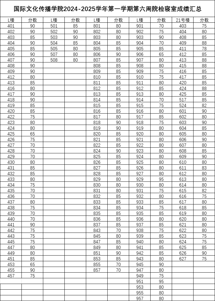 国际文化传播学院2024-2025学年第一学期第六周院检寝室成绩汇总